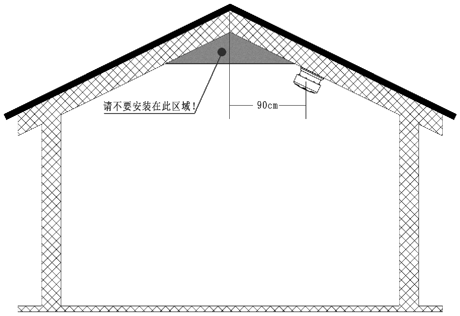 Wenn Sie den Rauchmelder an der geneigten oder oberirdischen Decke installieren, muss die Einbaulage mindestens 90 cm vom höchsten Punkt betragen.